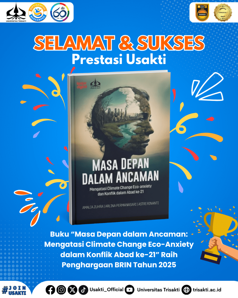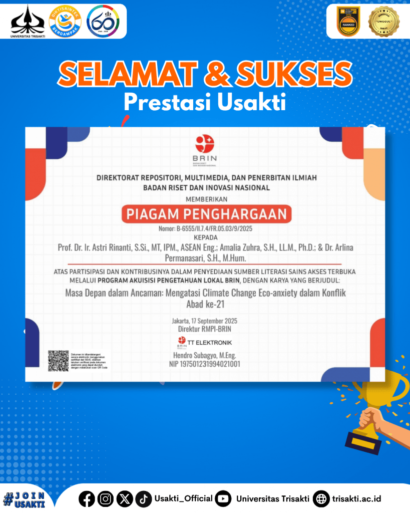 One of the international collaborative research outputs of the Faculty of Law, Universitas Trisakti, conducted in the 2023/2024 academic year under the title “Masa Depan dalam Ancaman: Mengatasi Climate Change Eco-Anxiety dalam Konflik Abad ke-21”, has been awarded for its contribution in providing open-access scientific literacy resources through the Local Knowledge Acquisition Program organized by the National Research and Innovation Agency (BRIN) in 2025.